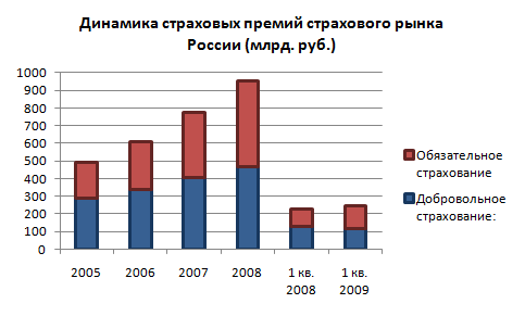 Основной тенденцией на страховом рынке России с учетом обязательного медицинского страхования являлось неуклонное увеличение объемов премий со среднегодовым темпом прироста 13,5%. Однако с началом экономического кризиса, отрицательный эффект от которого проявился именно в 1 квартале 2009 года, наметилось значительное сокращение темпов роста рынка. По итогам 1 квартала 2009 года страхование жизни оказалось наименее затронуто кризисом и показало наибольший прирост среди всех видов страхования (остальные виды, кроме добровольного страхования ответственности и ОМС, продемонстрировали отрицательную динамику) (25).