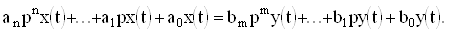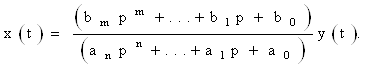 Этот коэффициент W(p) называется передаточной функцией данного дифференциального уравнения. Передаточная функция условно и в то же время наглядно отражает структуру и численные значения коэффициентов дифференциального уравнения, связывающего две переменные - независимую (входную) y(t) и искомую (выходную) x(t):