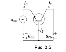 В схеме с общим эмиттером (см. рис. 3.3, б) входной цепью является цепь базы, а выходной – цепь коллектора. В схеме ОЭ напряжение uБЭ>0 прикладывается непосредственно к эмиттерному переходу и отпирает его. Напряжение uКЭ распределяется между обоими переходами: