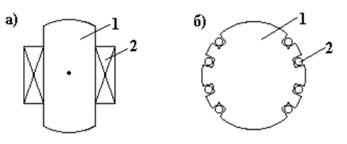 Роторы синхронных машин могут быть явнополюсными (с явновыраженными полюсами) и неявнополюсными (с неявновыраженными полюсами). На рис. 12.10а изображен сердечник 1 явнополюсного ротора с выступающими полюсами. На полюсах размещены катушки возбуждения 2. На рисунке 12.10б изображен неявнополюсной ротор, представляющий собой ферромагнитный цилиндр 1. На поверхности ротора в осевом направлении фрезеруют пазы, в которые укладывают обмотку возбуждения 2.