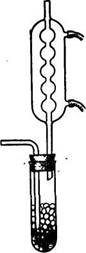 Большую пробирку (длина 20—25 см, диаметр 3—4 см) заполняют на 3/4 гранулированным оловом. Пробирку закрывают пробкой с двумя отверстиями: в одно вставляют газоподводящую трубку, а другое — форштосс обратного холодильника (рис.3).