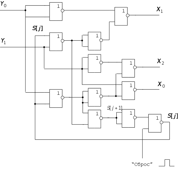 Особенностью полученной схемы является то, что она не содержит элементы памяти и задержки и, соответственно, не является тактируемой. Такой вариант реализации возможен для автоматов с двумя состояниями, одно из которых является абсолютно устойчивым. В нашем случае состояние блокировки есть абсолютно устойчивое состояние. Если комбинационная схема сформируем это состояние, то за счёт обратной связи по линии S запрещается реакция выходов X на изменение входных сигналов Y. Выход из этого устойчивого состояния возможен только принудительным обнулением линии S единичным уровнем на линии “Сброс”. Конфликтных “Состязаний” в рассматриваемом автомате не возникает.