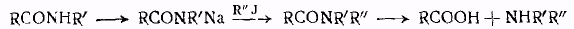 Последовательное замещение алкильными группами атомов водорода, находящихся у азота в первичных аминах, ведет к образованию вторичных и третичных аминов. Введение алкильных групп легко достигается действием на амин соответственного галоидного алкила или алкилсульфата. Состав конечного продукта реакции зависит в значительной степени от относительных количеств взятых в реакцию компонентов, а также и от условий опыта, и обычно очень трудно получить при алкилировании только одно из возможных производных амина и поэтому продукт реакции, как правило, представляет собой смесь вторичного и третичного аминов наряду с значительным количеством непрореагировавшего первичного амина, а часто с примесью некоторого количества соли четвертичного аммониевого основания. Получение сложной смеси при применении галоидного алкила является результатом образования при реакции галоидоводорода, который дает соли с находящимися в реакционной смеси аминами. Распределение галоидоводорода между аминами зависит от их относительной основности, их сравнительного количества, а также от растворимости солей аминов в реакционной смеси. При алкилировании ароматических аминов выделяющийся осадок обычно содержит значительное количество соли исходного амина, а в растворе остается алкилированный амин, который вступает в дальнейшую реакцию с галоидным алкилом. Такие затруднения могут быть преодолены, по крайней мере, до известной степени проведением алкилирования в присутствии веществ, способных связывать образующийся галоидозодород, например, углекислой или двууглекислой соли щелочного металла. Для выделения вторичных аминов, наряду с вышеупомянутыми способами, обычно, за исключением некоторых особых случаев, пользуются способностью вторичных аминов образовывать нитрозамины. При восстановлении нитрозаминов оловом с соляной кислотой или при нагревании их с минеральными кислотами получаются чистые вторичные амины. Другой способ, по которому удается получать вторичные амины с значительно лучшими выходами, основан на способности металлических производных многих замещенных амидов типа RCONHR реагировать с галоидными алкилами. Из продукта алкилирования при гидролизе получается вторичный амин