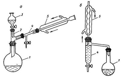 Виды приборов для синтезов с азеотропной отгонкой воды: а – с холодильником Либиха, б – с шариковым холодильником, 1 – реакционная колба, 2 – двурогий форштосс, 3 – капельная воронка, 4 – «ловушка» для воды, 5 – обратный холодильник.