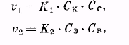 где v1— скорость реакции этерификации; v2— скорость реакции гидролиза; К1и К2— константы скорости обеих реакций; Ск, Сс, Сэ и Св — концентрации реагирующих и получающихся веществ (кислоты, спирта, эфира, воды).