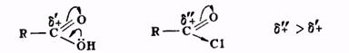Карбоновые кислоты, как видно из вышесказанного, реагируют со спиртами относительно медленно. Это объясняется слабой активностью карбонильной группы в кислотах по отношению к нуклеофильным агентам по сравнению с активностью той же группы в ангидридах и хлорангидридах кислот, поскольку +М-эффект гидроксильной группы приводит к уменьшению положительного заряда карбонильного углерода