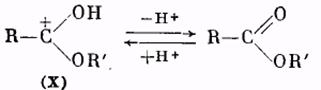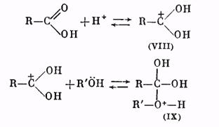 Роль катализатора заключается в протонировании карбонильного кислорода: при этом карбонильный атом углерода становится более положительным и более «уязвимым» по отношению к атаке нуклеофильного агента, которым является молекула спирта. Образующийся вначале катион (VIII) присоединяет молекулу спирта за счет неподеленных электронов кислородного атома, давая катион (IX):