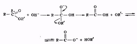 Гидролиз сложных эфиров представляет собой реакцию, обратную реакции их образования. Гидролиз может быть осуществлен как в кислой, так и в щелочной среде. Для кислого гидролиза сложных эфиров справедливо все, что было сказано выше применительно к реакции этерификации, об обратимости и механизме процесса, о методах смещения равновесия. Щелочной гидролиз сложных эфиров проходит через следующие стадии: