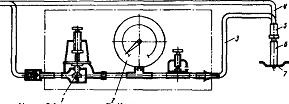 Для определения утечки сжатого воздуха из надпоршневого пространства применяют прибор К-69М. Воздух в цилиндры прогретого двигателя подают либо через редуктор 1 прибора, либо непосредственно из магистрали по шлангу 4 в цилиндр 7 через штуцер 6, ввернутый в отверстие для свечи или форсунки, к которому присоединяется шланг 3 при помощи быстросъемной муфты 5.