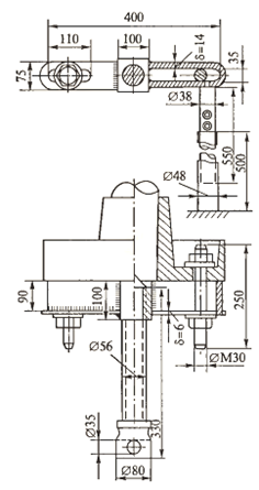 При отсутствии крана или монорельса выемку и ввод ротора в статор выполняют при помощи переносной балки (рис. 7.3), закрепляемой на корпус двигателя при помощи прижима (рис. 7.4). Балка укладывается на опорные скобы 1, укрепленные над рымами двигателя. Затем устанавливаются прижимные скобы 2 и через отверстия в опорных, прижимных скобах и рымах пропускаются штифты 3. Ввертыванием винтов 4, упирающихся в балку, прижимные скобы вместе со штифтами приподнимают кверху до тех