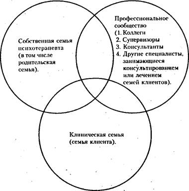 Занимаясь клинической работой и консультированием, Фримен заметил, что взаимоотношения с коллегами отражаются способности специалиста сохранять объективность оценнок в процессе работы с семьями. Далее все эти влияния на работе семейного психотерапевта рассматриваются более обстоятельно. На рисунке показана взаимосвязь различных систем, связанных с взаимоотношениями специалиста с его профессиональным и семейным окружением.