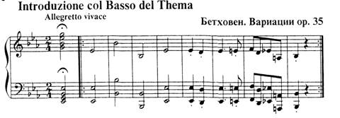 Сходным образом поступает и Бетховен в Вариациях ор. 35: извлекает из темы Контрданса бас и строит на нем в Интродукции малый вариационный цикл, предваряющий основной (эта же тема прозвучит и в финале "Героической" симфонии):