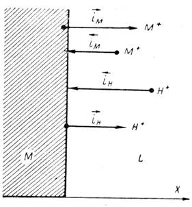 В отсутствии внешнего тока и при условии сохранения неизменной величины потенциала такое соотношение скоростей возможно лишь в том случае, если скорость разряда водородных ионов на ту же величину больше скорости обратного процесса, то есть: