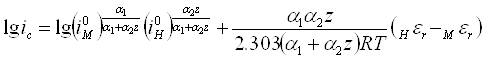 ic = i0H℮-(kηH(1 – α)F)/RT = i0M℮(aηMα2zF)/RT , (10)