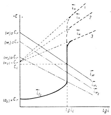 Скорость коррозии с кислородной деполяризацией поэтому почти не зависит (в известных пределах) от природы растворяющегося металла, в частности от величин его равновесного потенциала и анодной поляризации. В этом легко убедиться, если построить коррозионные диаграммы для трех различных металлов М, M1 и М2 (штрих-пунктирные линии на рисунке 5). На коррозию с кислородной деполяризацией может накладываться коррозия за счет выделения водорода, если равновесный потенциал водородного электрода в данном растворе положительнее равновесного потенциала корродирующего металла (прямые 1, 2 и 3 на рисунке 5). Величина предельного тока определяется растворимостью кислорода и величиной его коэффициента диффузии, но не зависит от природы металла, на котором восстанавливается кислород. В результате этого скорость процесса коррозии с кислородной деполяризацией меньше зависит от степени чистоты металла, чем скорость процесса коррозии с водородной деполяризацией, и изменяется в более широких пределах при изменении условий размешивания раствора и способа подвода кислорода (1,3-5).