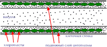 Кроме этих соединений в слоях оболочек многих водорослей присутствуют карбонат кальция, железо, альгиновая кислота, фукоидин, хитиноподобные вещества и т. д. Под оболочкой обычно располагается тонким слоем цитоплазма с ядром и окрашенным телом — хроматофором, а в центре клетки у большинства водорослей — вакуоль с клеточным соком. Форма хроматофоров в отличие от хлоропластов высших растений чрезвычайно разнообразна. Клетки всех водорослей, кроме сине-зеленых, имеют одно или много ядер.