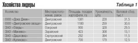 Анализ работы сельскохозяйственных предприятий по картофелеводству за 2008 год показывает, что высокий уровень агротехники, грамотно организованные обработки против болезней, вредителей и сорняков, а также своевременно проведенные поливы дали положительные результаты. Урожайность и объем производства картофеля оказались на высоком уровне. Общая площадь возделывания картофеля в сельхозпредприятиях составила 14 715 га, урожайность -236 цн/га, валовой сбор - 347 тыс. тонн. Более половины объема картофеля (183,8 тыс.тн) произведено в Дмитровском и Коломенском районах, а около двух третей объема (234,6 тыс.тн) сосредоточено в пяти районах: Дмитровском, Коломенском, Озерском, Зарайском и Каширском.