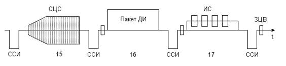 Передача сигналов ДИ в системе Телетекст. На рис. 1.1 показаны диаграммы импульсов при передаче пакета, содержащего ДИ в строке 16 (или 329) во время длительности КГИ. В строке 15 передается последний импульс сигнала цветовой синхронизации (СЦС) в системе СЕКАМ, в строке 17 - испытательный сигнал (ИС). В строках 16, 17 и так далее после строчного синхроимпульса (ССИ) передается защитная цветовая вспышка (ЗЦВ).