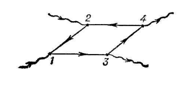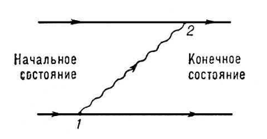 Діаграма на мал. 2 відображає обмін фотоном між двома електронами: один електрон в крапці 1 випускає фотон, який потім в крапці 2 поглинається другим електроном. Як вже говорилося, такого роду обмін наводить до появи взаємодії; т. о., дана діаграма змальовує елементарний акт електромагнітної взаємодії двох електронів. Складніші діаграми, відповідні такій взаємодії, повинні враховувати можливість обміну декількома фотонами; одна з них змальована на мал. 1.3.