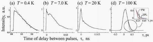 Мал. 3.2 Криві спаду двохімпульсної пікосекундної фотонної ехо-камери (а) і некогерентної фотонної ехо-камери (b-d) для системи цинк-октаетілпорфін в толуолі. Пунктирна лінія на (а) відповідає апроксимуючій експоненціальній залежності, використовуваній для визначення часу оптичного дефазування, Т2. Вставка на (d) демонструє розділення ділянок кривої спаду, відповідних бесфононной лінії (ZPL) і фононному крилу (PW).