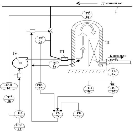 Расход газа на каждый воздухонагреватель II контролируется датчиком 2а в комплекте со вторичным прибором 2б и поддерживается на заданном уровне регулятором расхода 2г с помощью исполнительного механизма 2д с регулирующей заслонкой 2е, установленной на подводе газа к горелке III.