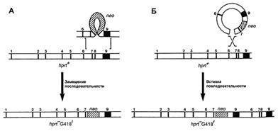 Рис. 4. Действие системы позитивной – негативной селекции: А) интеграция вектора в нужный участок генома, приводящая к нокауту гена, Б) случайная интеграция (синтез тимидин-киназы и гибель клеток) (19).