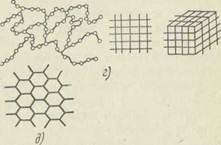 Пространственные или сетчатые полимеры образуются при соединении («сшивке») макромолекул между собой в поперечном направлении прочными химическими связями непосредственно или через химические элементы или радикалы. В результате такого соединения макромолекул образуется сетчатая структура с различной густотой сетки (рис. 1 г). Редкосетчатые (сетчатые) полимеры теряют способность растворяться и плавиться, они обладают упругостью (например, мягкие резины). Густосетчатые (пространственные) полимеры отличаются твердостью, повышенной теплостойкостью, нерастворимостью. Иногда образование пространственной структуры сопровождается даже возникновением хрупкости (смола в стадии резит). Пространственные полимеры лежат в основе конструкционных неметаллических материалов. К сетчатым полимерам относятся также пластинчатые полимеры, которые имеют плоскостное двухмерное строение. Примером такого полимера является графит. Пластинчатая (паркетная) структура показана на рис. 1, д.