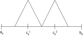 – распределения вероятностей треугольной формы (треугольные нечеткие функции принадлежности) со следующими свойствами