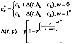 При случайной мутации ген, подлежащий изменению, принимает случайное значение из интервала своего изменения. В неравномерной мутации значение гена после оператора мутации рассчитывается по формуле: