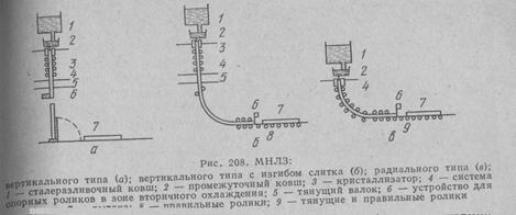 В зависимости от размера слитка МНЛЗ делятся на слябовые, блюмовые и заготовочные. Естественно, что размеры промежуточных ковшей, кристаллизаторов, а также состав огнеупоров при этом разные. При непрерывном методе разливки жидкая сталь заливается в кристаллизатор, под влиянием водоохлаждаемых стенок которого начинается первичное охлаждение. Выходящая из кристаллизатора заготовка с жидкой сердцевиной интенсивно охлаждается (вторичное охлаждение). После затвердевания по всему сечению заготовка разрезается на мерные длины. Таким образом, непрерывная разливка позволяет получать непосредственно из жидкой стали полупродукт, готовый для прокатки на чистовых станках.