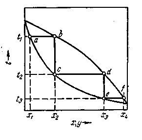 Рис. 1.1. Изображение процесса разделения бинарной смеси путем ректификации на диаграмме t—Х—у.