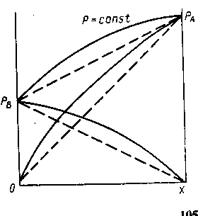 Рис. 1.3. Диаграмма р — х для смеси с положительным отклонением от закона Рауля (пунктиром показаны соответствующие линии для идеального раствора)