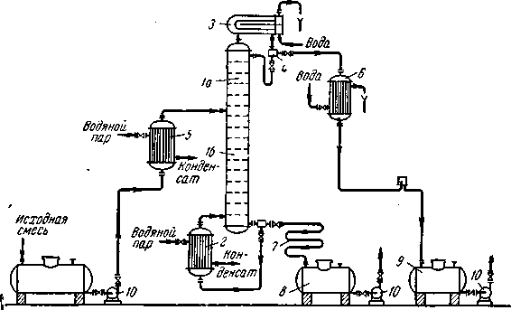 1— ректификационная колонна (а — укрепляющая часть, б — исчерпывающая часть); 2 —кипятильник; 3 — дефлегматор; 4 — делитель флегмы; 5 — подогреватель исходной смеси;6 — холодильник дистиллята (или холодильник-конденсатор); 7 — холодильник остатка (или нижнего продукта); 8, 9 сборники; 10 — насосы.