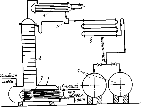 Пары конденсируются в дефлегматоре 3, охлаждаемом водой, и получаемая жидкость разделяется в делителе 4 на дистиллят и флегму, которая направляется на верхнюю тарелку колонны. Следовательно, с помощью - дефлегматора в колонне создается нисходящий поток жидкости.