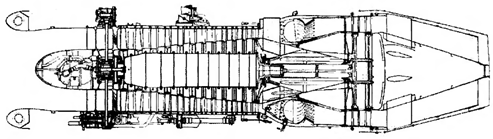 Работы над проектированием и созданием ТРД, не имевших винта и способных обеспечить в несколько раз большие, чем ТВД, скорости полета, начал в 1937 г. А.М. Люлька. Сотрудник Харьковского авиационного института Люлька специалист по паротурбинной технике. Он в инициативном порядке разработал проекты ТРД как с центробежным одно- и двухступенчатым компрессором (РТД-1, 1937 г.), так и с осевым компрессором (РД-1,1938 г.) (рис. 5). Рабочие чертежи выбранного ТРД РД-1 с осевым компрессором и с тягой 500 кгс были сданы в производство на Кировский завод в Ленинграде в 1940 г. Двигатель имел шестиступенчатый компрессор с