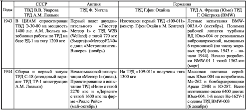 Сравнительная хронология ряда важнейших событий при создании первых газотурбинных и турбореактивных двигателей в СССР, Англии и Германии дана в табл. 2.