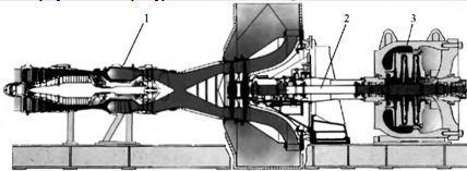Рис. 15. Применение ГТД для прямого привода нагнетателя природного газа: 1 - ГТД; 2 - трансмиссия; 3 - нагнетатель.