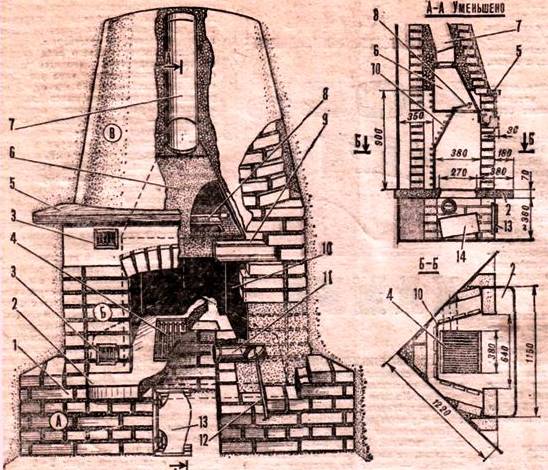 1 — кирпичный корпус, 2 — бетонная подушка. 3 — решетка воздуховода, 4 — решетка топки. 5 — декоративная доска. 6 — конус дымосборника, 7 — цилиндрическая проставив трубы, 8 — заслонка топки, 9 — швеллер, 10 — металлический корпус топки, 11 — труба-воздуховод, 12 — ручка заслонки поддувала, 13 — дверке полости золосборника, 14 — ящик-золосборник;