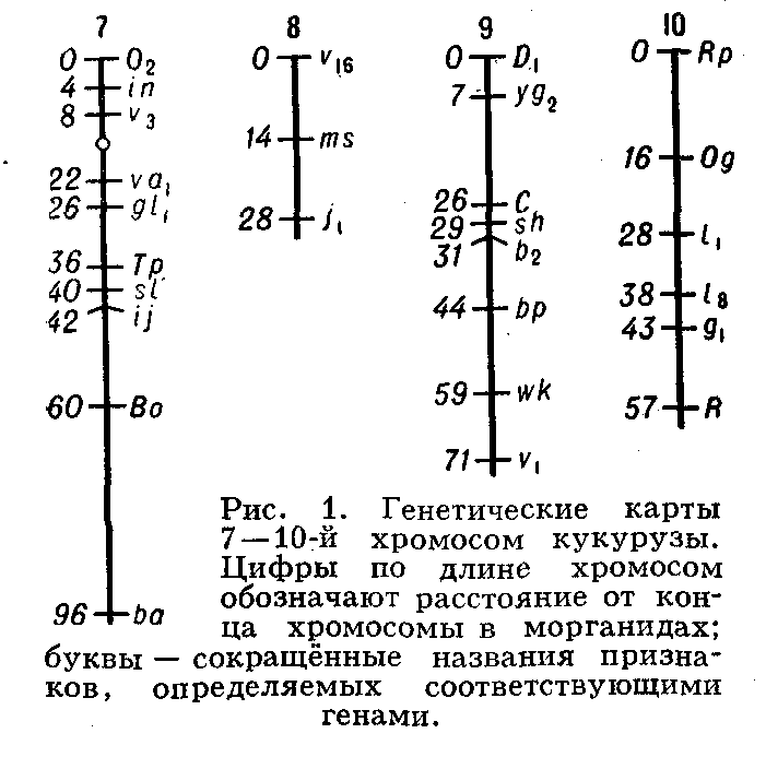 Генетические карты хромосом составляют для каждой пары гомологичных хромосом. Группы сцепления нумеруют последовательно, по мере их обнаружения. Кроме номера группы сцепления, указывают полные или сокращённые назв. мутантных генов, их расстояния в морганидах от одного из концов хромосомы, принятого за нулевую точку, а также место центромеры. Составить Генетические карты хромосом можно только для объектов, у которых изучено большое число мутантных генов. Например, у дрозофилы идентифицировано свыше 500 генов, локализованных в её 4 группах сцепления, у кукурузы — около 400 генов, распределённых в 10 группах сцепления (рис. 1). У менее изученных объектов число обнаруженных групп сцепления