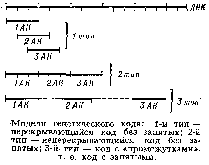 аденин (А), гуанин (Г), цитозин (Ц), тимин (Т); в РНК вместо тимина присутствует урацил (У). Кроме них, в составе нуклеиновых к-т обнаружено ок. 20 редко встречающихся (т. н. неканонических, или минорных) оснований, а также необычных Сахаров. Так как количество кодирующих знаков Генетического кода (4) и число разновидностей аминокислот в белке (20) не совпадают, кодовое число (т. е. кол-во нуклеотидов, кодирующих 1 аминокислоту) не может быть равно 1. Различных сочетаний по 2 нуклеотида возможно лишь 42 = 16, но этого также недостаточно для зашифровки всех аминокислот. Американский учёный Г. Гамов предложил (1954) модель т р и п л е т н о г о генетического кода, т. е. такого, в котором 1 аминокислоту кодирует группа из трёх нуклеотидов, называемых кодоном. Число возможных триплетов равно 43 = 64, а это более чем втрое превышает число распространённых аминокислот, в связи с чем было высказано предположение, что каждой аминокислоте соответствует несколько кодонов (так называемая вырожденность кода). Было предложено много различных моделей генетического кода, из которых серьёзного внимания заслуживали три модели (см. рис.): перекрывающийся код без запятых, неперекрывающийся код без запятых и код с запятыми. В 1961 Ф. Крик (Великобритания) с сотрудниками получил подтверждение гипотезы триплетного неперекрывающегося кода без запятых. Установлены след. осн. закономерности, касающиеся генетического кода: 1) между последовательностью нуклеотидов и кодируемой последовательностью аминокислот существует линейное соответствие (коллинеарность генетического кода); 2) считывание кода начинается с определённой точки; 3) считывание идёт в одном направлении в пределах одного гена; 4) код является неперекрывающимся; 5) при считывании не бывает промежутков (код без запятых); 6) генетический код, как правило, является вырожденным, т. е. 1 аминокислоту кодируют 2 и более триплетов-синонимов (вырожденность генетического кода уменьшает вероятность того, что мутационная замена основания в триплете приведёт к ошибке); 7) кодовое число равно трём;