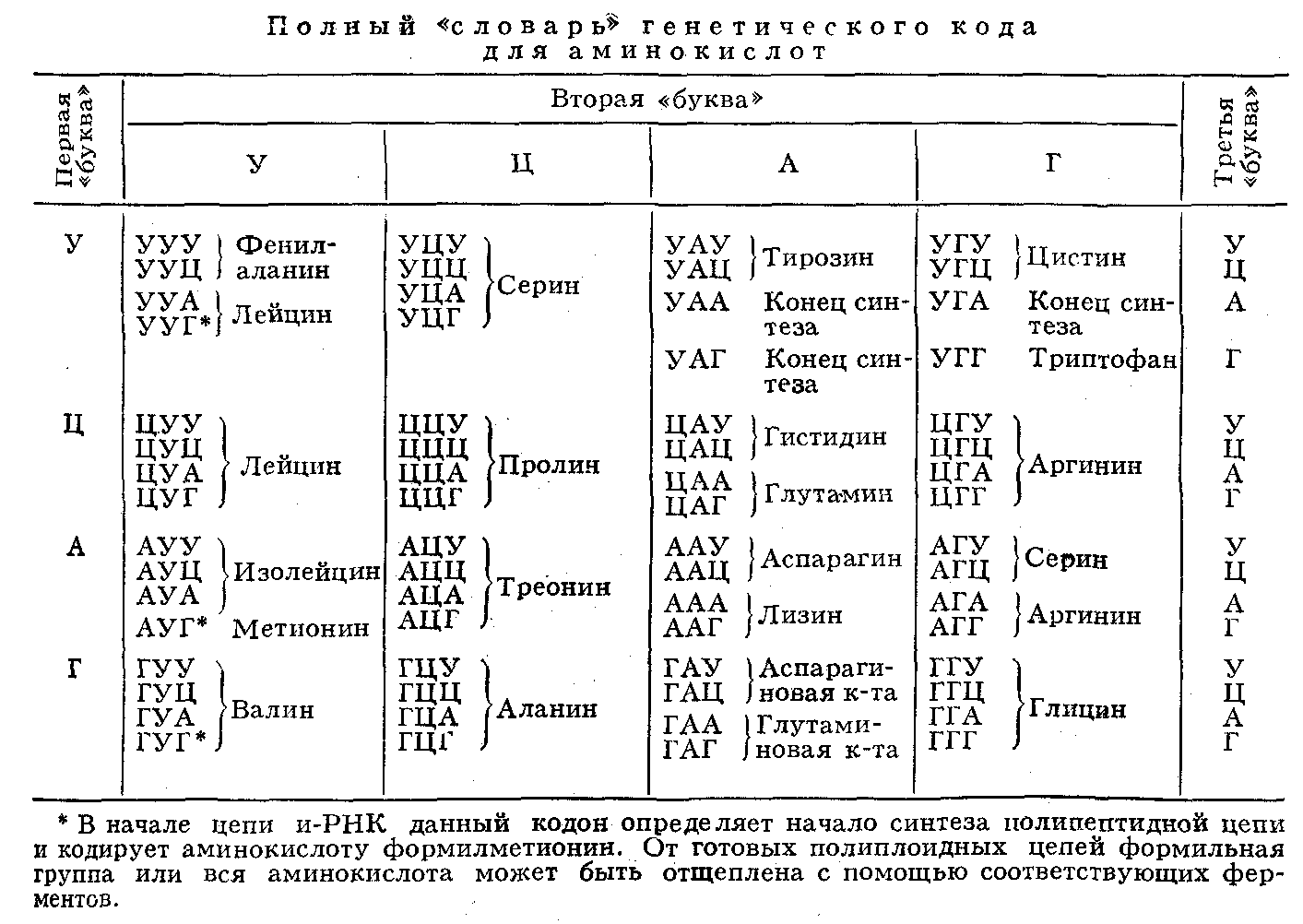 Из 64 кодонов у бактерий и фагов 3 кодона — УАА, УАГ и УГА — не кодируют аминокислот; они служат сигналом к освобождению полипептидной цепи с рибосомы, т. е. сигнализируют о завершении синтеза полипептида. Их наз. терминирующими кодонами. Существуют также 3 сигнала о начале синтеза — это т. н. инициирующие колоны — АУГ, ГУГ и УУГ,— к-рые, будучи включёнными в начале соответствующей информационной РНК (и-РНК), определяют включение формилметионина в первое положение синтезируемой полипептидной цепи. Приведённые данные справедливы для бактериальных систем; для высших организмов многое ещё не ясно. Так, кодон УГА у высших организмов может быть значащим; не совсем понятен также механизм инициации полипептида.