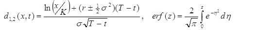 де х − ціна базового активу; t − час, що пройшов з моменту укладення опціонної угоди; C (x,t) − функція залежності ціни опціону на купівлю від ціни базового активу x та часу t; T − час дії опціонної угоди, вимірюється в роках; K − ціна реалізації опціону; r − безризикова ставка, що неперервно нараховується.