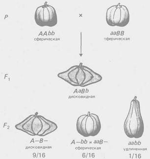 Рис. 3 - Комплементарное взаимодействие генов, определяющих форму плода тыквы (соотношение 9:6: 1)