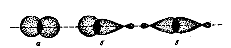 Как показано ранее, простая ковалентная связь между атомами образуется парой обобщенных электронов. Образование этой пары в свете представлений квантовой механики заключается во взаимном перекрывании облаков электронов, осуществляющих связь; перекрывание происходит при сближении атомов на определенное расстояние. Между этими атомами на прямой, соединяющей их центры, возникает наибольшая электронная плотность (область максимального перекрывания облаков). К этой области повышенной плотности отрицательного заряда притягиваются положительно заряженные ядра атомов, следствием чего и является возникновение химической cвязи.