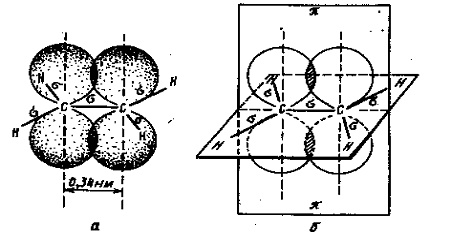 Рис. 5. Перекрывание двух негибридизованных 2р-обриталей в молекуле этилена: а- объемное изображение перекрывающихся негибридизованных 2р-орбиталей; б- схематическое изображение этих орбиталей на плоскости.