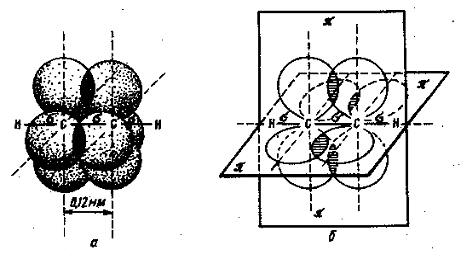 Таким образом, одна из электронных пар двойной связи между атомами углерода осуществляют обычную s-связь, вторая электронная пара образуется электронами не участвующими в гибридизации и сохранившими p-состояние. Облака этих электронов, сохранившие форму объемных восьмерок, направлены перпендикулярно к плоскости, в которой расположены s-связи молекулы этилена и перекрываются над и под этой плоскостью.