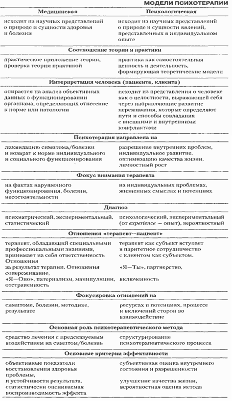 Работы 3. Фрейда и Г. Селье привели к пониманию того, что большинство болезненных проявлений представляют собой неспецифические защитные реакции на патогенный фактор, и стимулировали формирование новой парадигмы психиатрии (Ю.Л. Нуллер, 1992-1995). В рамках этой парадигмы изменялась и ориентация психотерапии. Сложившиеся модели психотерапии сопоставимы как медицинская и психологическая (см. табл.1). В настоящее время идет интенсивный процесс выработки целостной (холистической) парадигмы психотерапии, в которой эти модели представляют собой не альтернативу, а полюса психотерапевтического пространства.