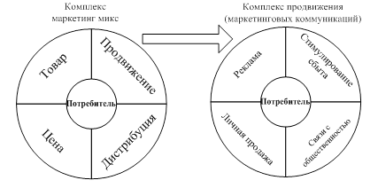 У структурі комплексу marketing mix (маркетинг микс) комплекс маркетингових комунікацій (просування) складається із чотирьох частин: реклами, особистого продажу, стимулювання збуту й зв'язків із громадськістю (мал. 1.3.1).