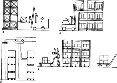 Рис. 3. Выполнение различных операций в зоне хранения: а, б, в – механизированным способом; г – с помощью средств малой механизации