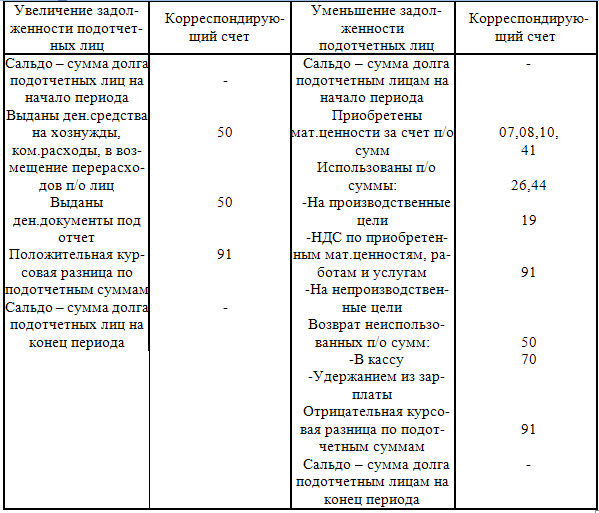 Синтетический учет расчетов с подотчетными лицами ведется на активно-пассивном счете 71 "Расчеты с подотчетными лицами" (таблица 1):